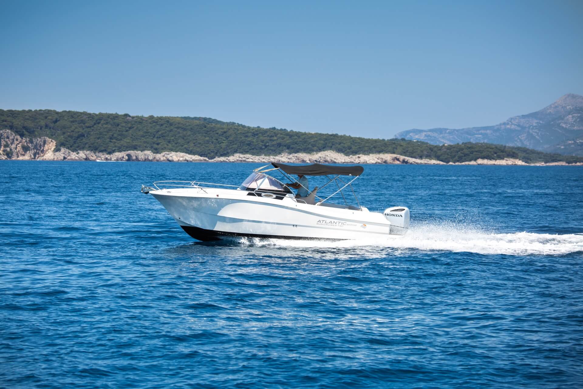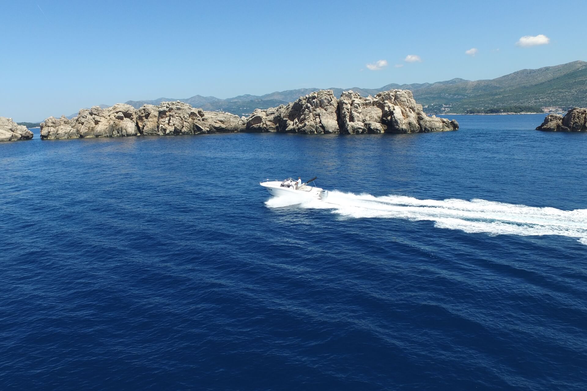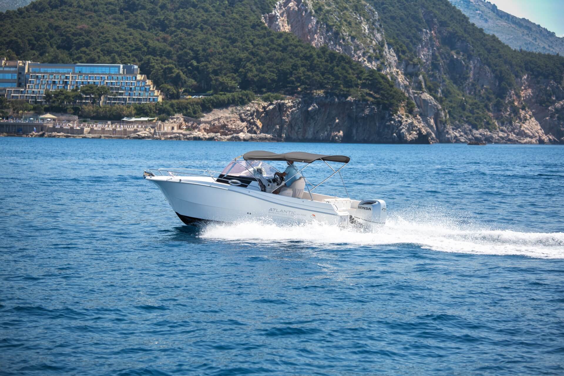 Private boat tours with the Atlantic Sun Cruiser 730, a powerboat, that ensures comfort for even larger group of friends and family, up to 6 people. Feature such as a cabin and separate marine toilet plus the well-organised exterior that can become a spacious sun-deck will make your Speedboat tour Dubrovnik islands exceptional.